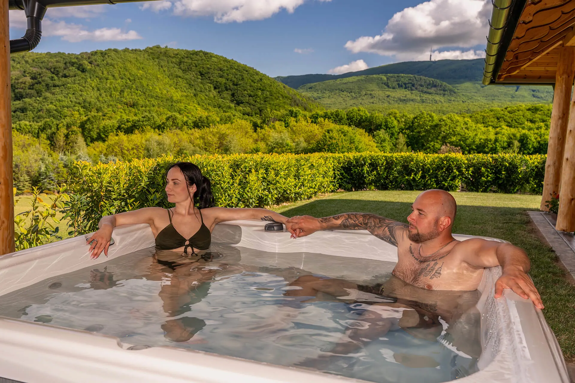 A jakuzzi télen-nyáron vendégeink rendelkezésére áll mivel fedett teraszon kapott helyet, így a rossz idő sem befolyásolja a használatát. A félkör panoráma itt is biztosított a romantikus kikapcsolódáshoz. A teljes ellazulást a házunk által bekészített Palik borászat boraival tesszük még romantikusabbá. Természetesen ez a szolgáltatás is korlátlanul használható, amihez köntöst is biztosítunk.