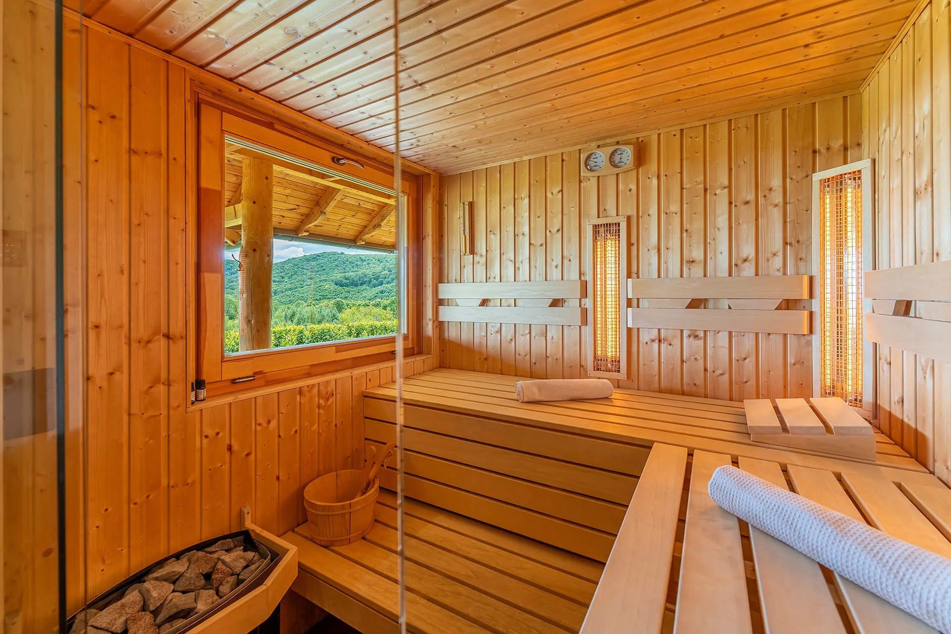 A panorámás szauna finn, illetve infra szaunaként is funkcionál. Fürdőköpenyt, illetve törölközőt biztosítunk a használatához. Bármikor, korlátozás nélkül használhatják vendégeink.